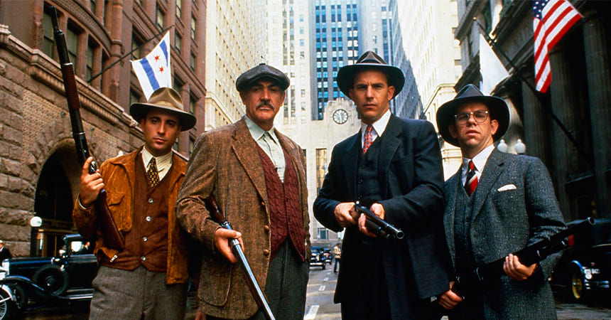Отличный криминальный детектив о противостоянии молодого агента министерства финансов Эллиота Несса (Кевин Костнер) и матёрого уголовника Аль Капоне (Роберт Де Ниро), который в то время кошмарил город Чикаго будучи местным авторитетом. Фильм основан на реальных событиях с известной долей художественного вымысла как мы понимаем.